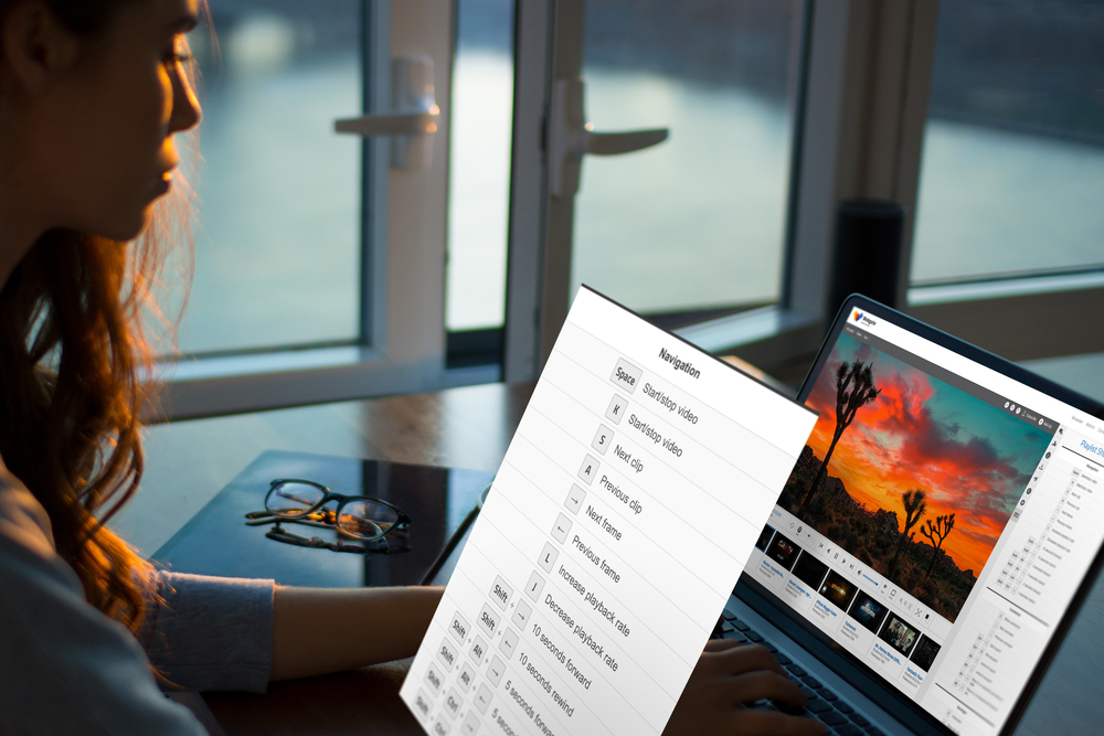 No matter if you're in a gallery or a playlist: you can always use the shortcuts. For example just press the space key to start and stop a video. The same goes for hitting the „K“ button. With the arrow keys you can jump to the next or the prior frame. When you hit the „L“ the video plays faster. „J“ does the opposite.