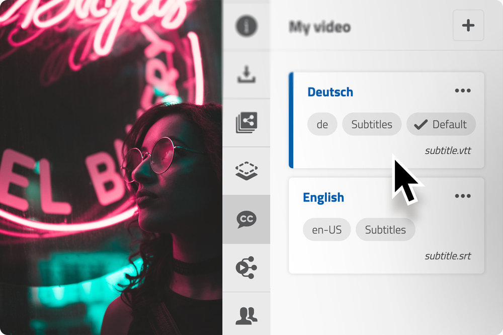 Add subtitles or transcriptions to your clips. All you need to do is upload a suitable .vtt or .srt file and choose its type and language.